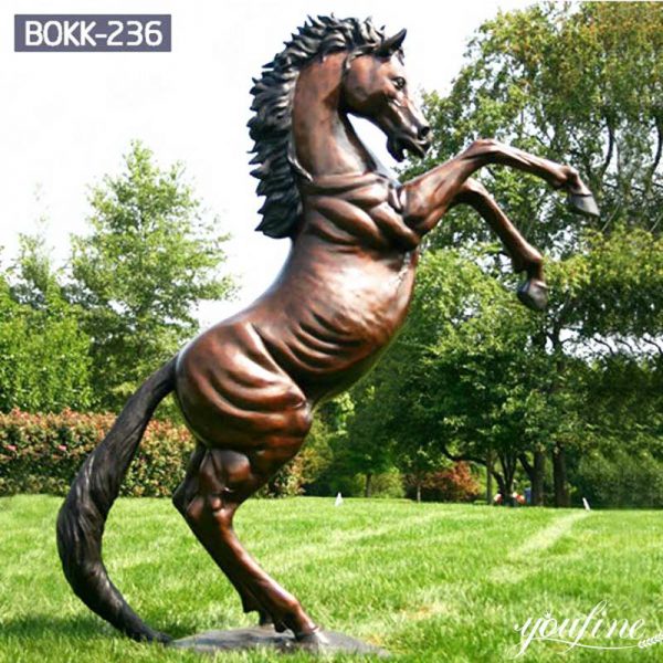 This is an animal sculpture made of bronze. A horse raises its front hooves high, its mane is neatly draped on its back, its muscles are tight and powerful, and its two hind legs and tail are supported on the ground. , forming a stable structure of the bronze horse sculpture, producing a shocking visual effect.