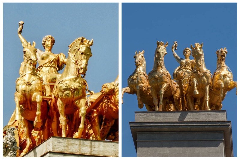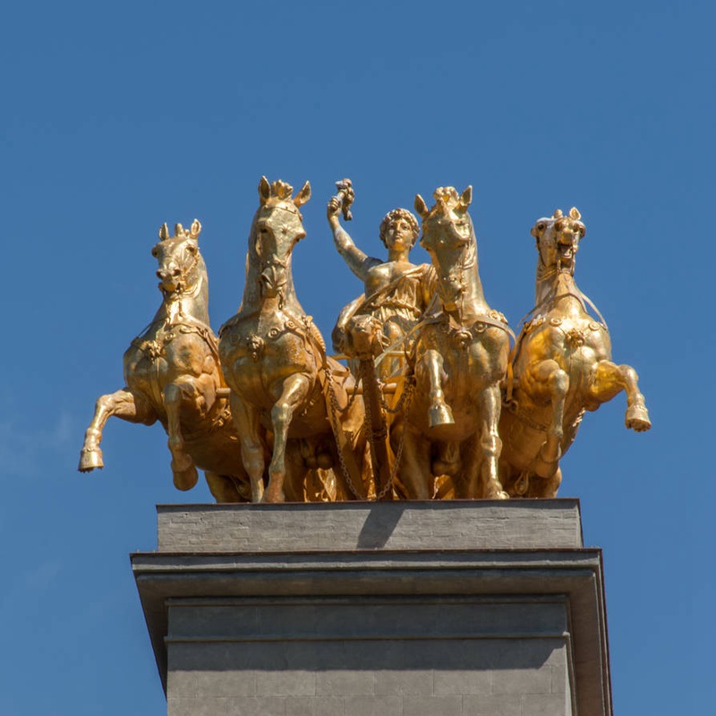 Please admire the stunning beauty of our bronze gold horse sculpture, every detail hand-cast by fine artists. The stunning carriage composed of four horses and the golden bronze figure holding the reins shows the grandeur to the extreme.