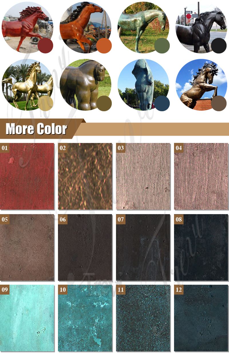 Trevi artists are all over 40 years old and have at least 15 years of experience in patina bronze sculptures, so their control of patina is very precise. At the same time, they are very good at color matching, so we could provide a variety of rich color plates for you to choose from. After you confirm, our artists would patina the bronze equestrian statue perfectly, and as time goes by, the color would become more natural.